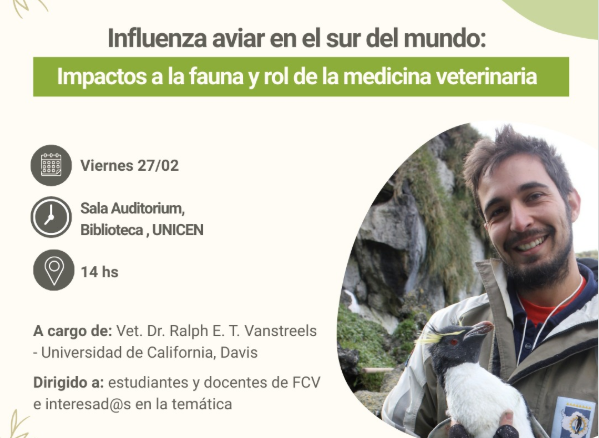 La actividad estará a cargo del Dr. Ralph E. T. Vanstreels (Universidad de California, Davis), médico veterinario especializado en fauna silvestre. Su trabajo se centra principalmente en el estudio de las enfermedades que afectan a la fauna costera y marina. Desde 2023, participa activamente en la investigación de la epidemiología y los impactos de la influenza aviar sobre la conservación de aves y mamíferos marinos en las regiones patagónica, subantártica y antártica.