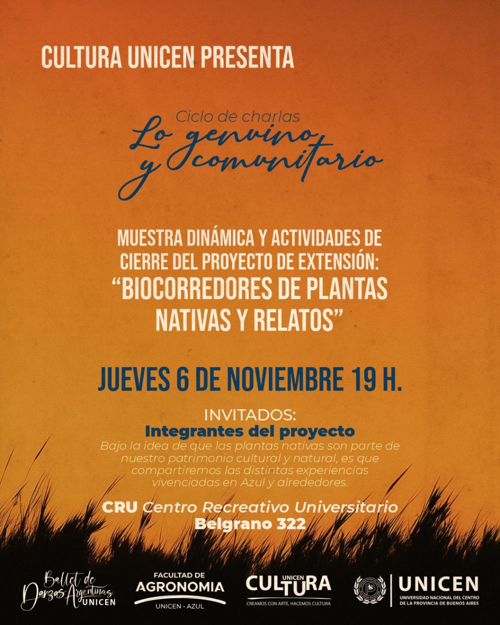 Este jueves 6 de noviembre, a las 19, en el Centro Recreativo Universitario, (Belgrano 322) se realizará la tercera y última fecha del ciclo “Lo genuino y lo comunitario” con una muestra dinámica y actividades de cierre del proyecto de Extensión "Biocorredores de plantas nativas y relatos" (Facultad de Agronomía) donde se compartirán experiencias de Azul y alrededores.