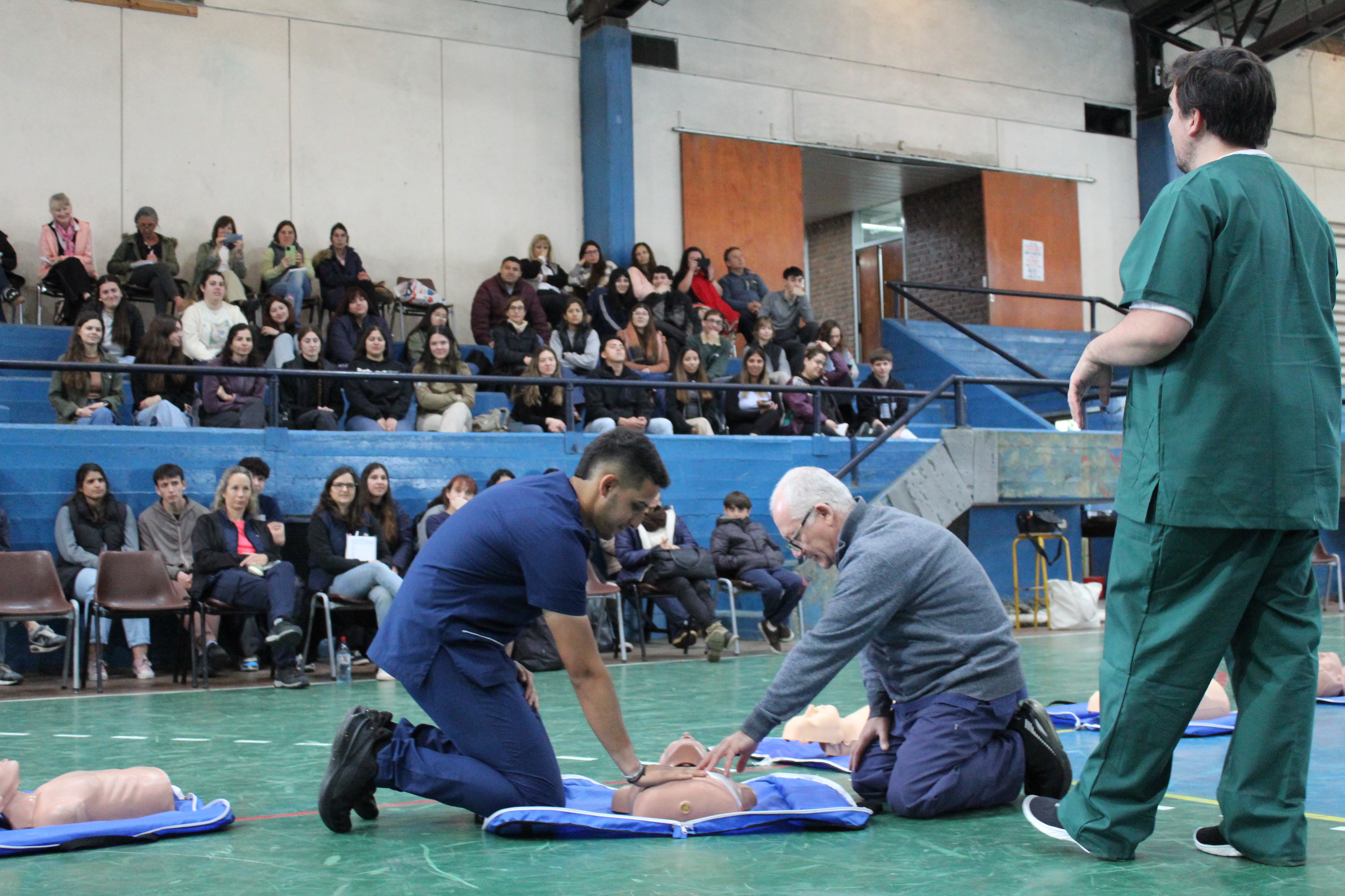 La propuesta se desarrolló en dos turnos. Durante la mañana, la capacitación estuvo a cargo del docente Prof. Lic. Juan Cúccaro, acompañado por los estudiantes de la carrera de Medicina Jeremías Dries y Nicolás Guerra. En el turno de la tarde, se sumó también el docente de la Facultad de Ciencias de la Salud, Dr. Alejandro Díaz, director del proyecto de extensión “Nuestras manos para tu corazón” y del Núcleo de Investigación de la unidad académica.