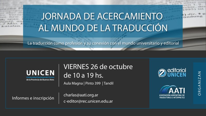 Esta jornada es organizada conjuntamente entre la editorial UNICEN y la Asociación Argentina de Traductores e Intérpretes (AATI) y representa el primer evento de nivel nacional e internacional gestado y organizado íntegramente desde la editorial gracias a las gestiones realizadas oportunamente y a los contactos originados con distintas organizaciones vinculadas al mundo editorial.